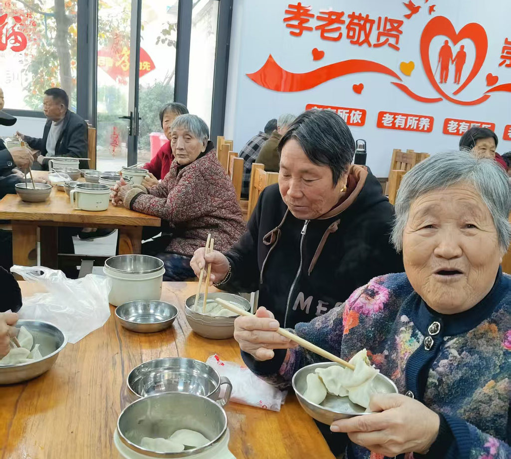 看看这边是,村里志愿者和热心村民分工协作,切菜调馅,擀皮捏合,到十一点半,一锅锅热腾腾的饺子一个个盛到老人的碗中,大家拿着筷子吃着皮薄馅大,香气扑鼻的饺子,真是吃在嘴里,暖在心里。