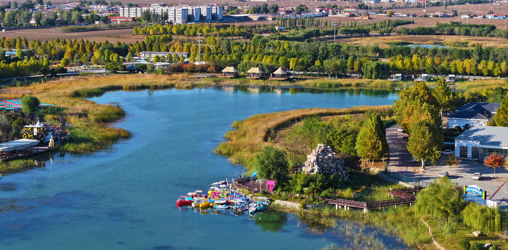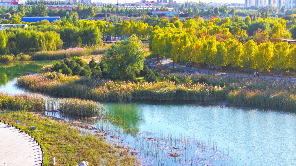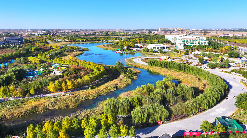 11月1日,无人机拍摄的宁晋县凤鸣湖公园及周边景观。