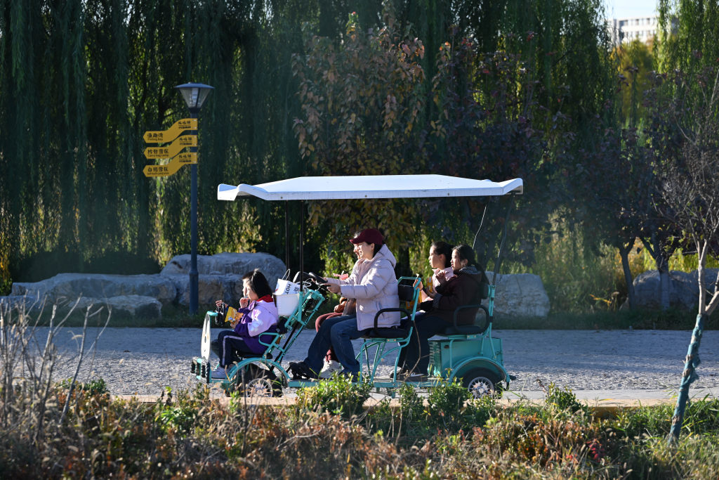 11月1日,居民在宁晋县凤鸣湖公园赏景游玩。