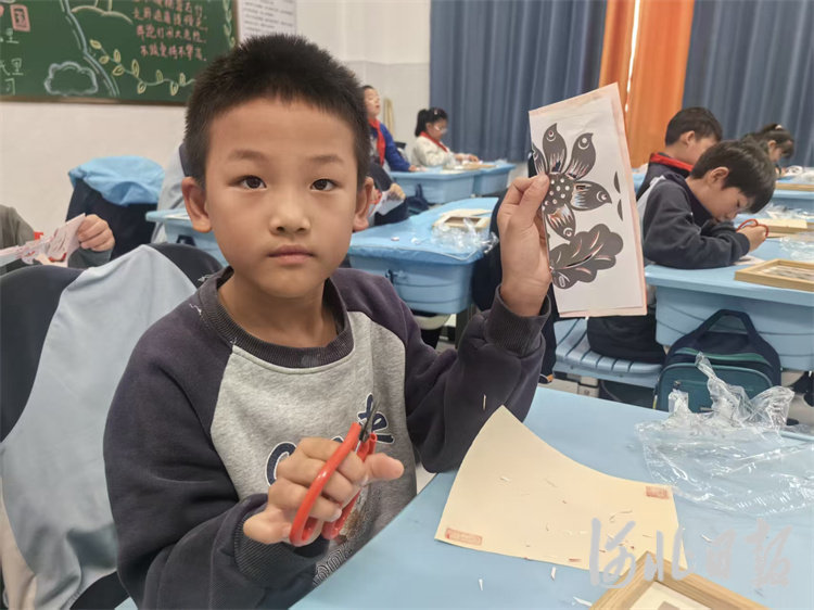 图为活动现场,一位学生展示刚完成的剪纸作品。