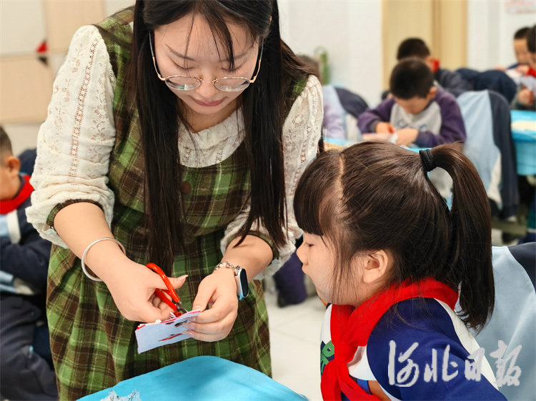 图为活动现场,老师手把手教学生完成剪纸作品。