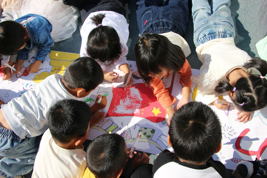 操场上,孩子们手握画笔,在“绘祖国·颂华诞”长卷画布上认真勾勒国旗、天安门的轮廓,将对祖国的热爱融入每一笔色彩。剪纸鲜艳五星红旗、黏土捏的飞机坦克、彩笔勾勒的热闹家乡街景……活动同步展出的红色主题画展,汇集了孩子们以“祖国、英雄、家乡”为灵感的画作,在交流中加深对祖国、家乡与英雄的理解。党员教师与中大班孩子们并肩列队,共同唱响《歌唱祖国》《我爱北京天安门》等经典曲目,让爱国情怀在歌声中传承。