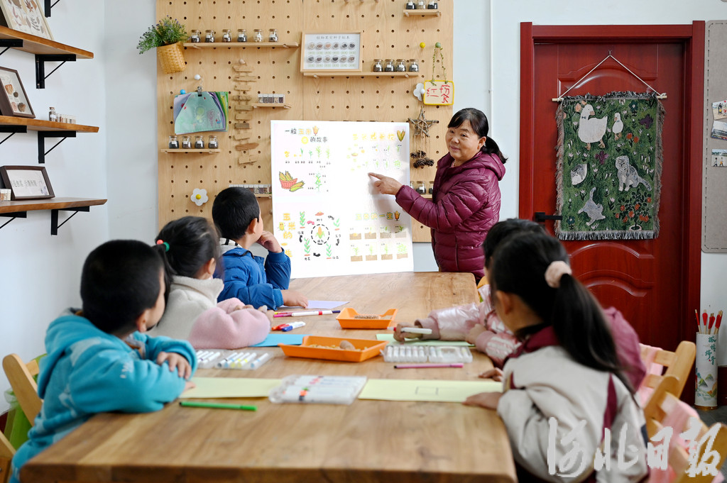 10月28日,衡水市冀州区码头李镇西方家庄村“会友小院”里,方兰英给孩子们讲玉米的生长过程。河北日报记者 焦磊摄
