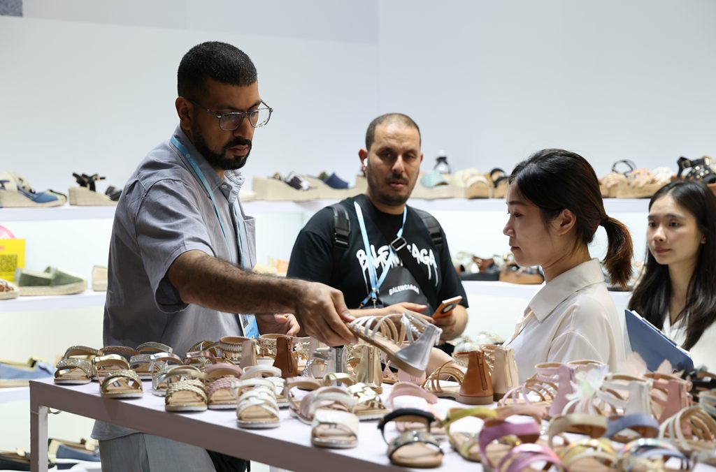 10月31日,客商在广交会上参观、选购鞋子。新华社发
