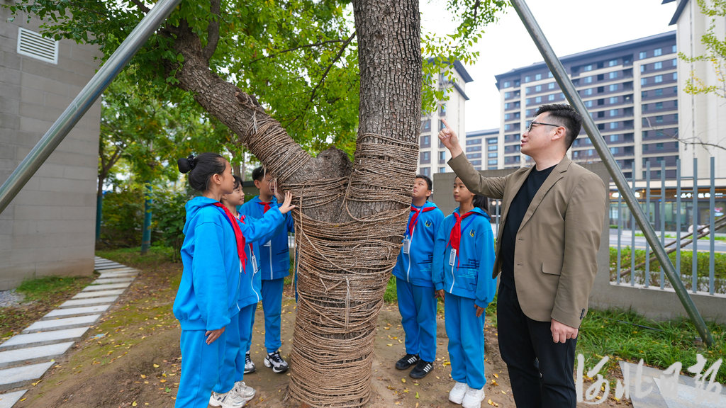 10月16日,在雄安史家胡同小学,雄安新区教育局工作人员正在为学生们介绍古树相关情况。河北日报见习记者 李畅摄