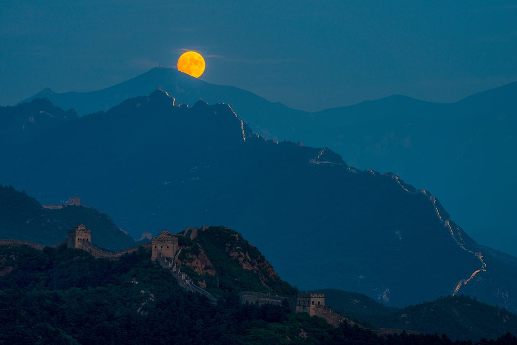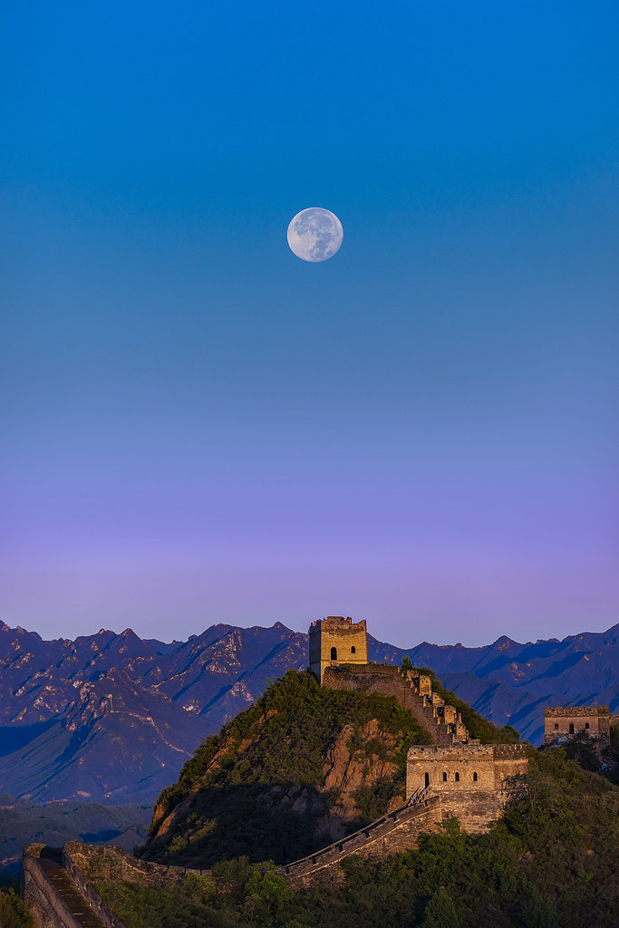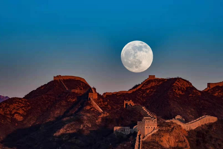 金山岭长城上升起月亮。图片来源:金山岭长城公众号