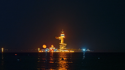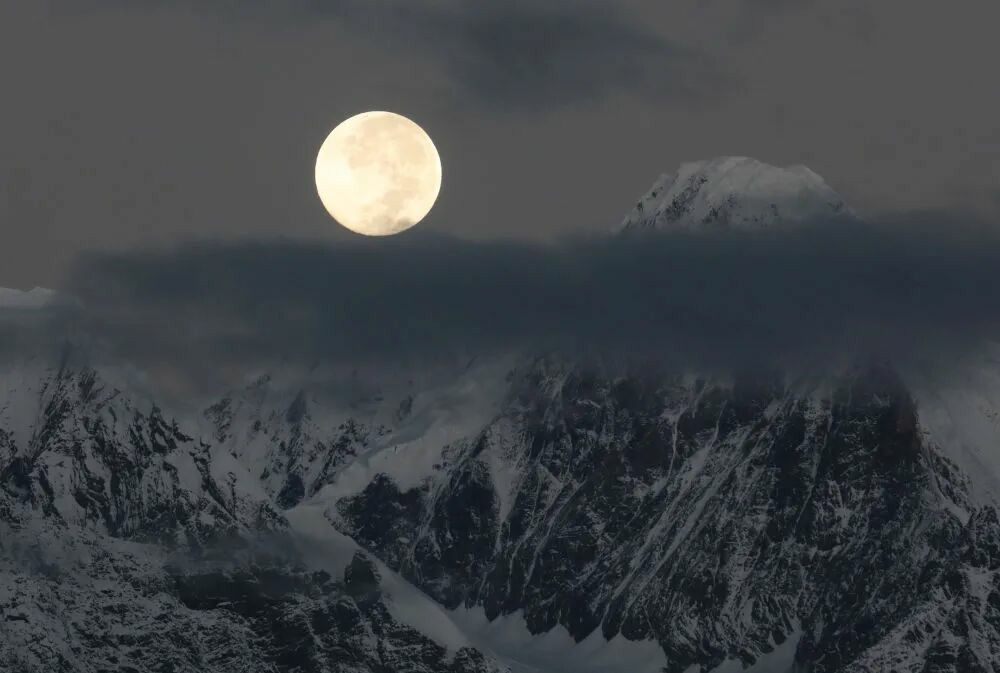 2024年10月17日,在云南迪庆藏族自治州梅里雪山拍摄的年度最大满月。(白继开摄)