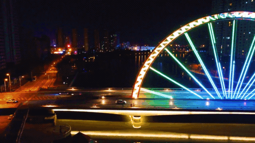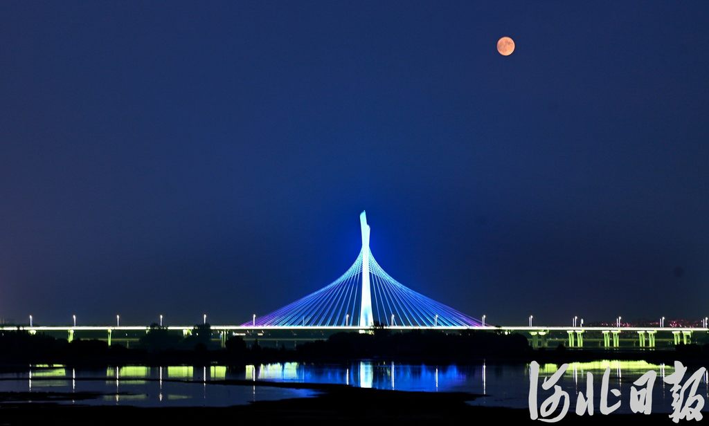 石家庄市复兴大街滹沱河特大桥在中秋圆月的映衬下霓虹璀璨。河北日报资料片