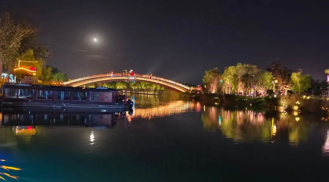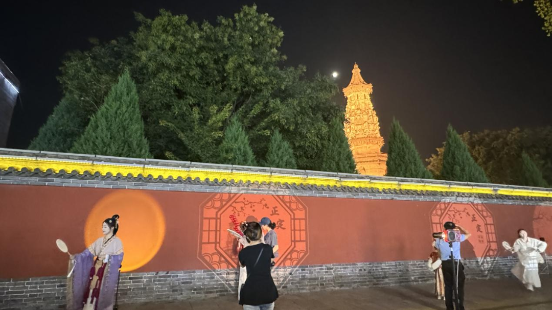 身着汉服在正定月色下拍照的游客。图片来源:正定发布