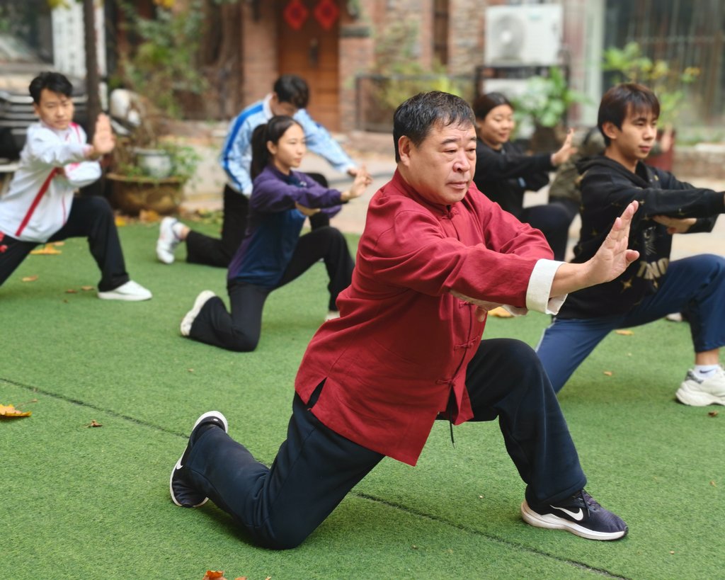 在随后的互动教学环节,学生们在教练指导下学习基本步型与腿法组合,虽初涉此艺,却热情高涨,沉浸于传统武术的力与美之中。