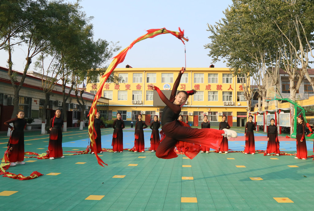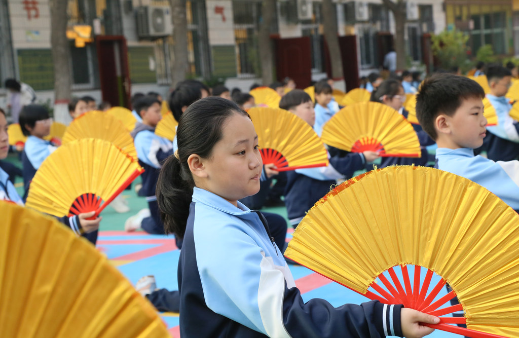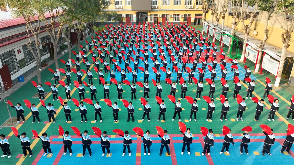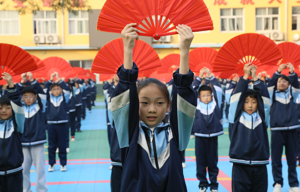 11月4日,平乡县北牌小学扇子操社团的学生在练习扇子操。