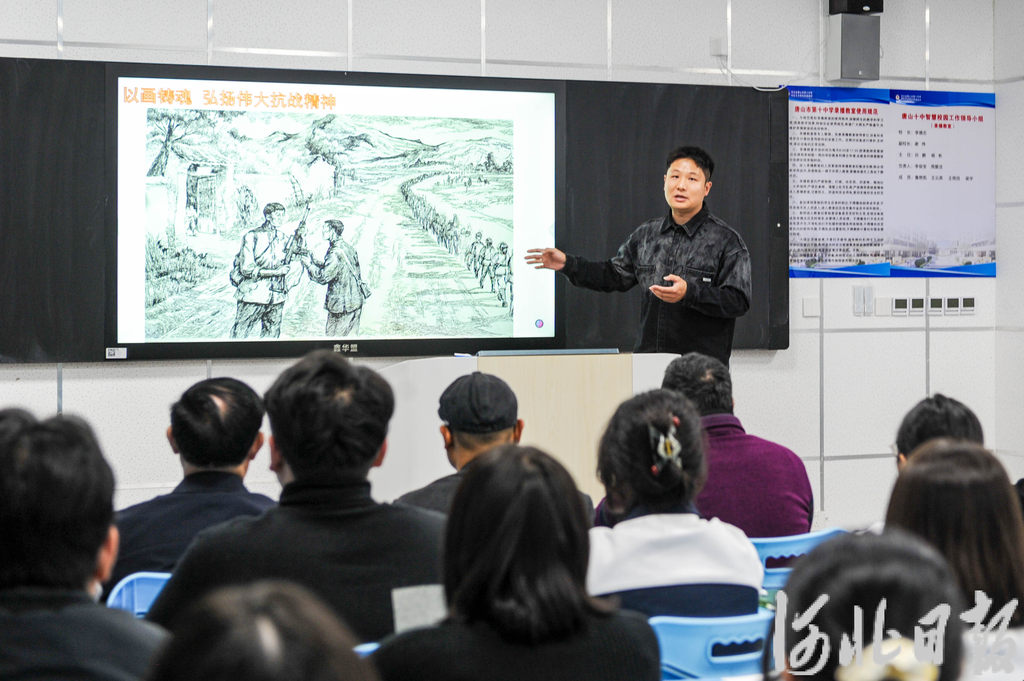 课程在CCTV-9的一段关于冀东抗日堡垒户赵凤池的纪录片片段中拉开序幕。唐山十中思政教师羡敬贤以深情的讲述,将师生带入那段烽火连天的岁月。随后,该校美术教师孔祥瑞展示了唐山十中美术组教师为纪念抗日战争暨世界反法西斯战争胜利80周年而创作的6幅抗战家史系列画作,并分享了创作心得。这些作品艺术地再现了历史,填补了相关影像资料的空白,并被CCTV-9纪录片频道收录。
