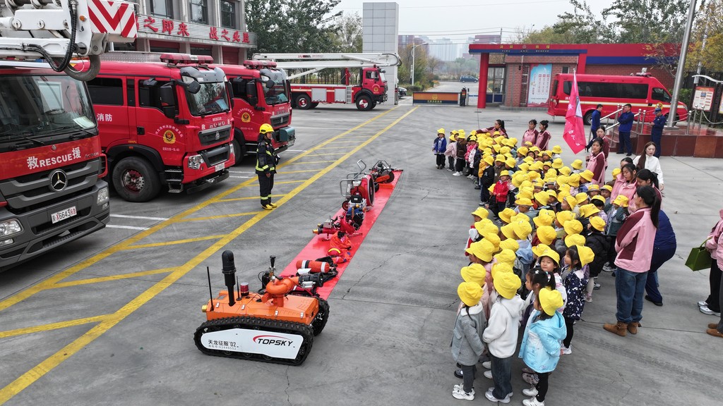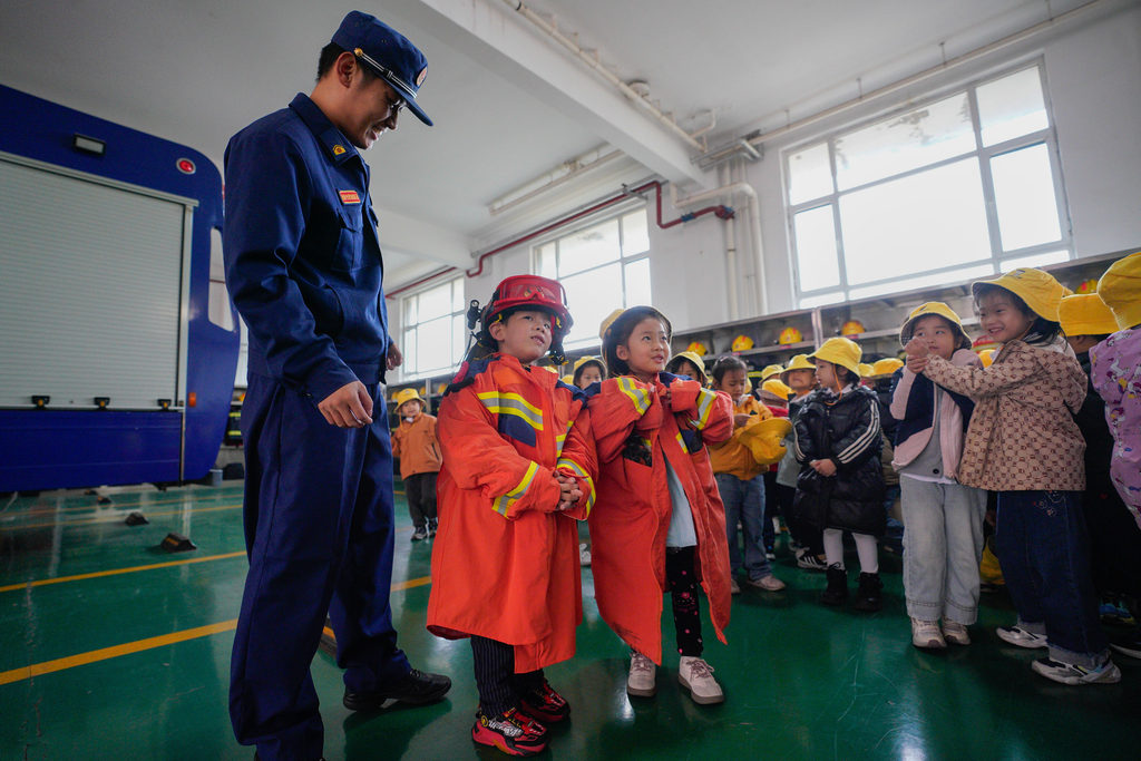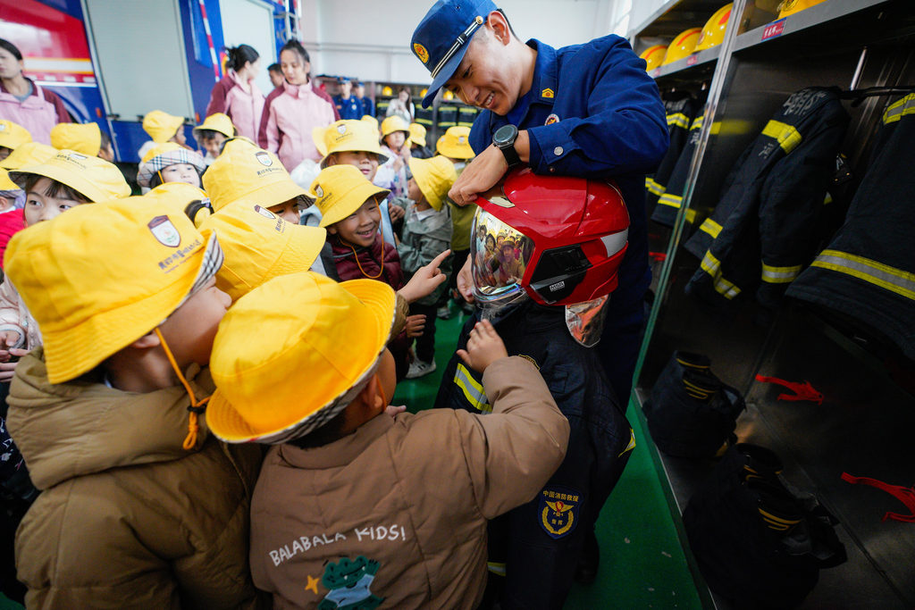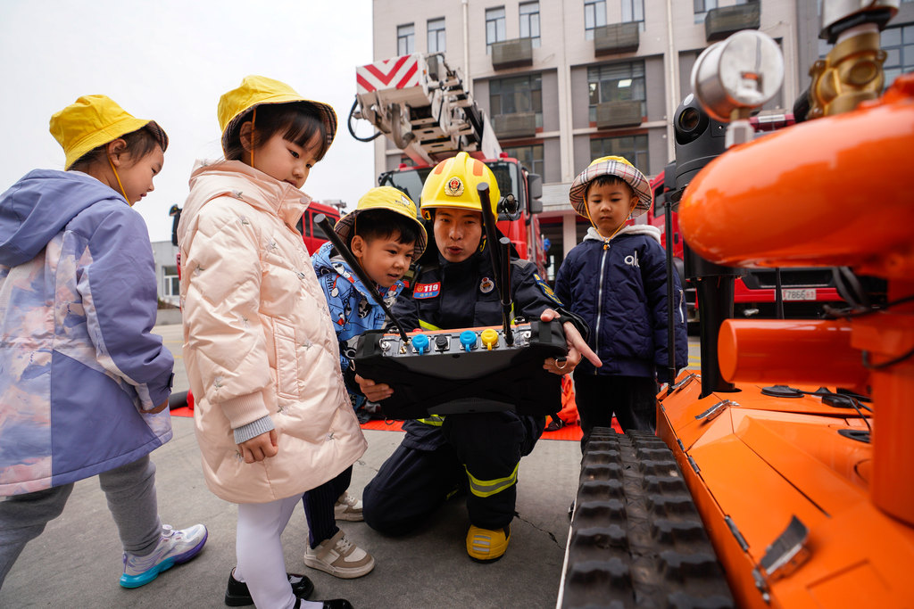11月6日,在黄骅市消防救援大队,消防员给小朋友讲解消防工具的使用方法。