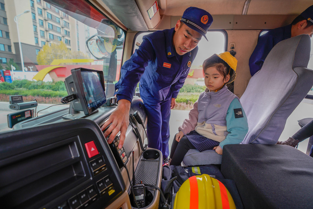11月6日,在黄骅市消防救援大队,消防员给小朋友讲解消防车上的装备。