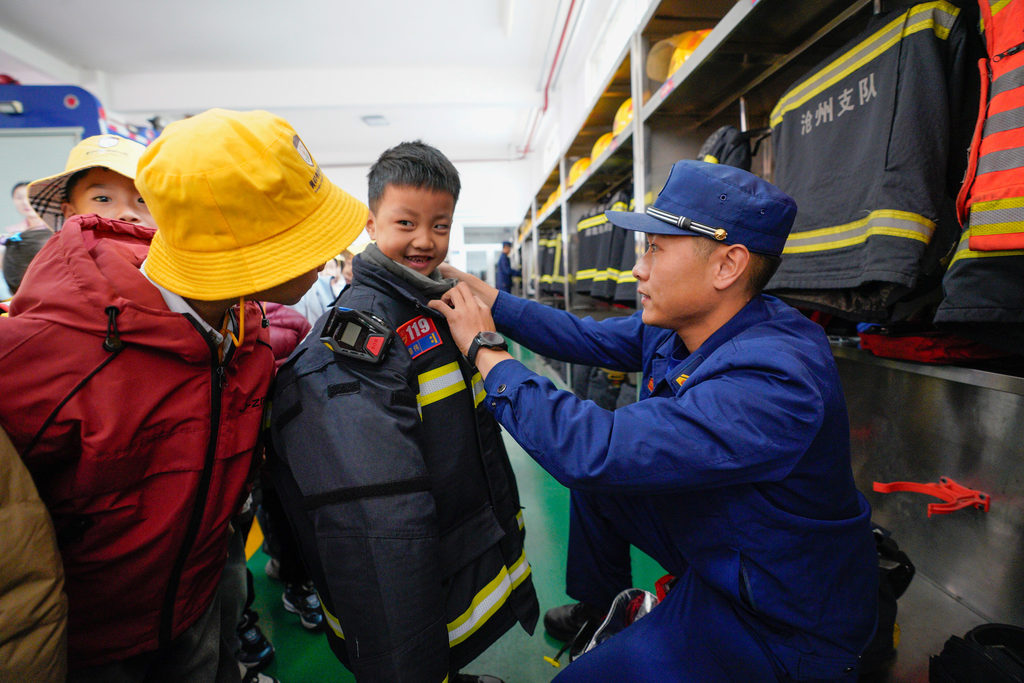 11月6日,在黄骅市消防救援大队,小朋友在消防员帮助下体验消防救援设备。
