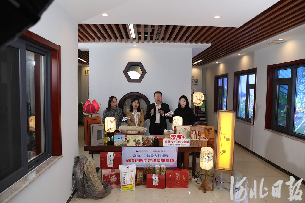 11月5日,在高碑店市“媒体+”赋能乡村振兴梁家营镇专场直播间内,传统食品企业负责人刘丽丽(左2)正向网友们推介当地特色农产品。李艳鹏 摄