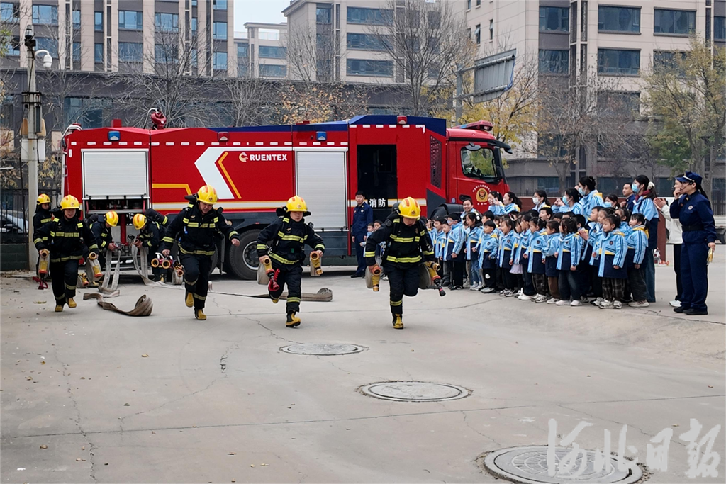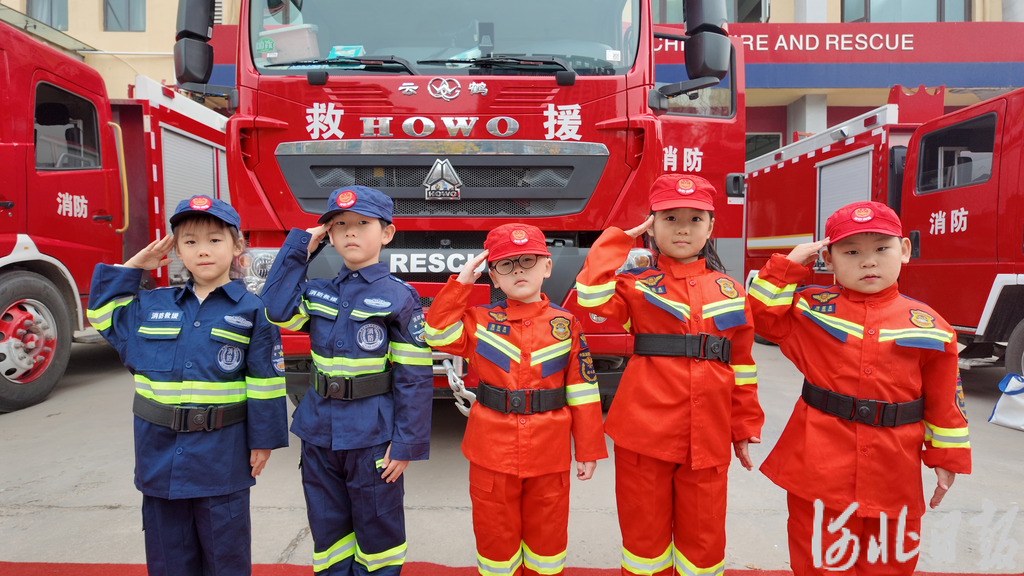 随后,大班幼儿走进威县消防救援站,参观消防科普教育馆、观摩云梯车等专业装备,观看消防员模拟出警演示,还通过“穿消防服大比赛”“拔河互动”等环节,近距离体验消防器材、感受消防员的责任担当,在欢乐中学习安全知识。
