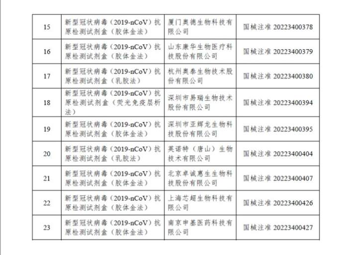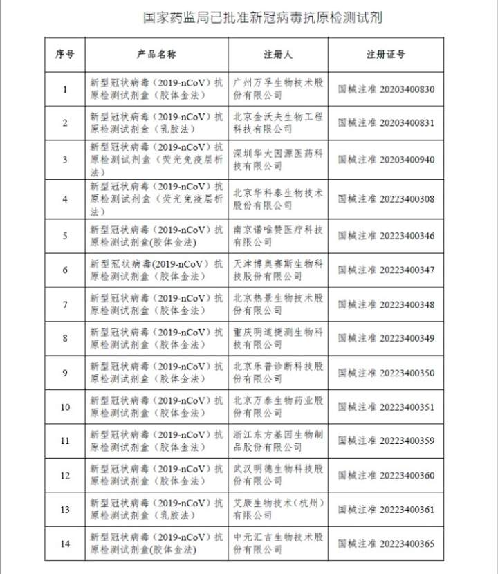 附件:国家药监局已批准的新冠病毒抗原检测试剂