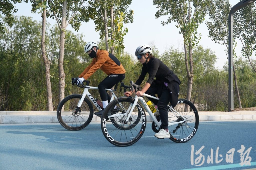 11月4日12时许,微风拂过,阳光正好。石家庄环城绿道大谈驿站,不时有骑行爱好者上道骑行。