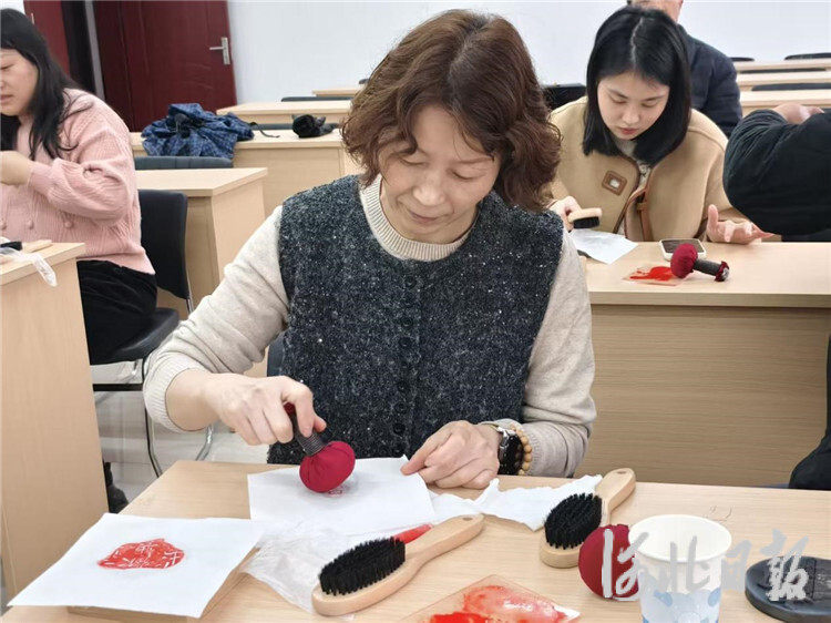 活动现场,老师从拓印历史讲起,介绍其在文物保护、文化传承中的作用,并结合河北本地特色,通过工具展示与实物演示,让参与者快速了解技艺价值。在示范环节,老师拆解宣纸裁剪、刷纸固定、墨汁调配、捶打拓印等流程,慢动作演示并强调“轻、匀、稳”核心要领,通过细致指导增强参与者信心。