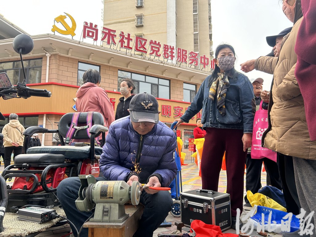 11月6日,“梁屯百姓大集”上,志愿者为居民提供磨剪子服务。王甜甜摄