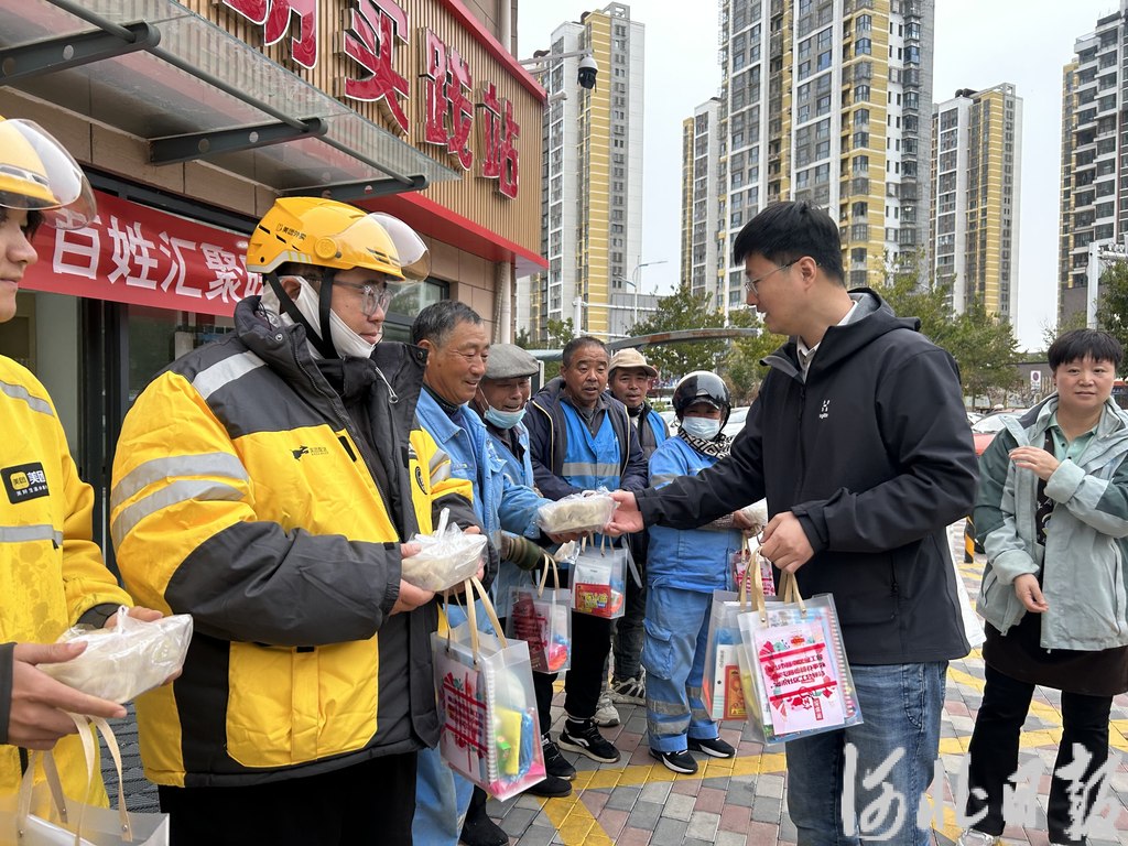 11月6日,“梁屯百姓大集”上,社区联合爱心企业为环卫工、快递员送饺子。王甜甜摄
