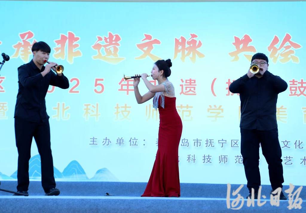 紧随其后的,是国家级非物质文化遗产抚宁鼓吹乐展演。当《柳青娘》的旋律响起,抚宁鼓吹乐团的传承人们手持唢呐、笙、锣等传统乐器登台。熟悉的民间曲调在乐手们的演绎下愈发悠扬婉转,细腻的演奏技巧让在场师生惊叹不已。“原来传统乐器能演奏出这么丰富的音色!”来自机电工程学院的学生王韩博一边用手机记录,一边兴奋地说。