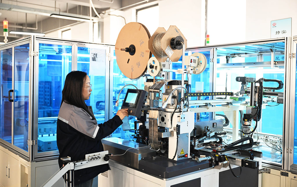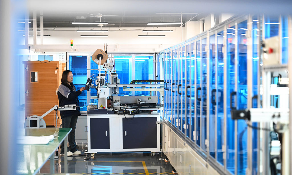 10月28日,位于邢台临空经济区中关村协同(冀南)创新基地的河北烯旺新材料科技有限公司,工人在调试石墨烯模组自动化生产线。