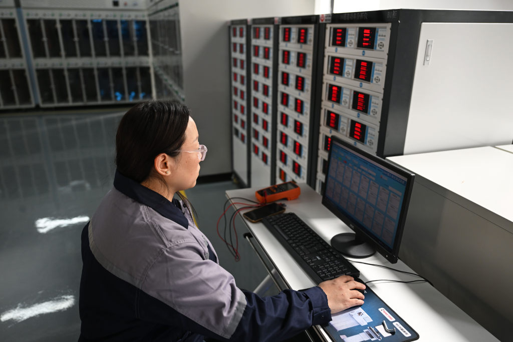 10月28日,位于邢台临空经济区中关村协同(冀南)创新基地的河北烯旺新材料科技有限公司,工人在进行模组的老化测试。