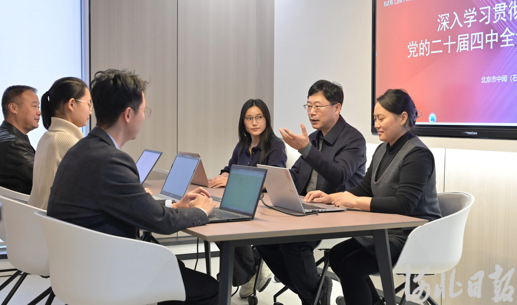 11月12日,省政协委员、石家庄律师协会副会长张永泽(右二)在律所宣讲党的二十届四中全会精神。河北日报记者刘冉摄