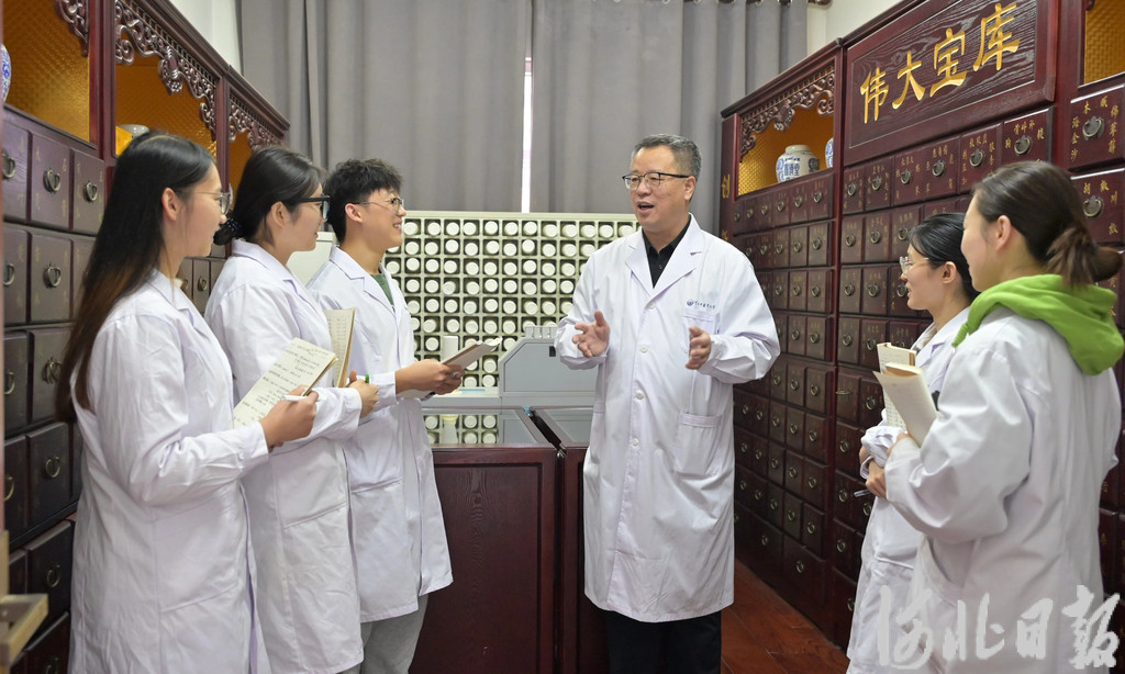 11月12日,省政协委员、河北中医药大学教授方朝义(右三)在学校宣讲党的二十届四中全会精神,并与学生交流。河北日报记者刘冉摄