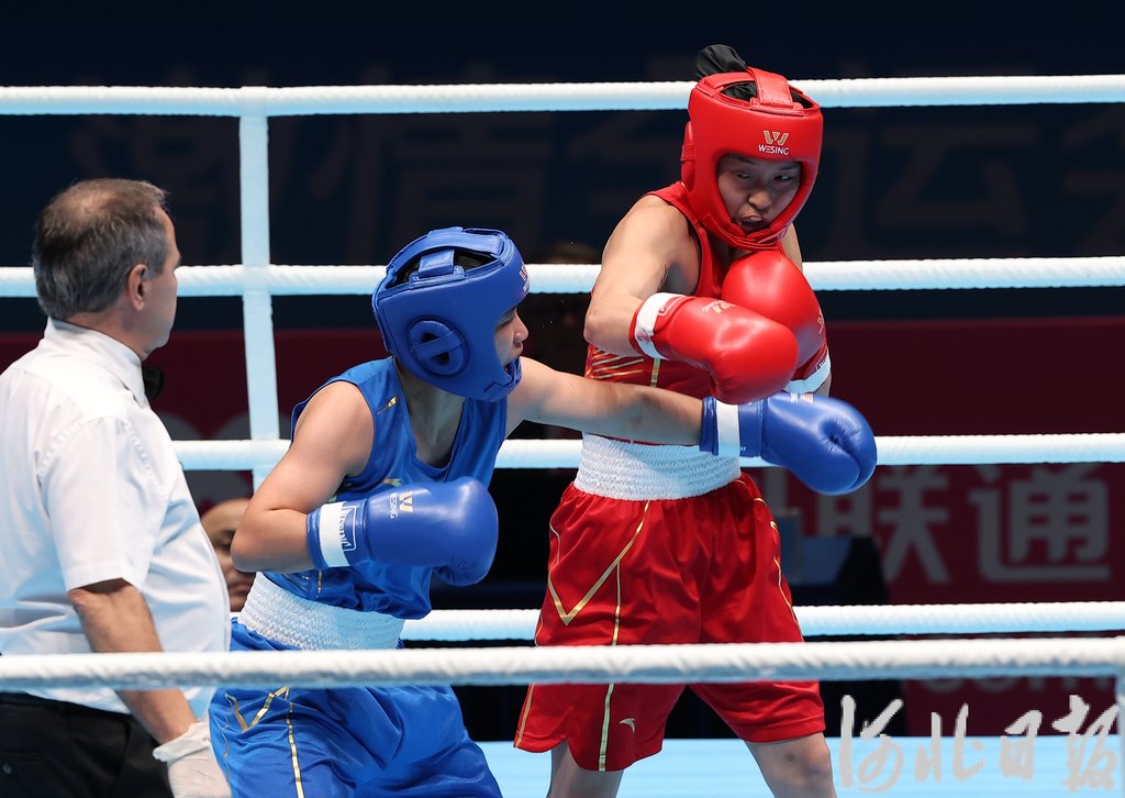 11月14日,在第十五届全运会女子拳击54公斤级决赛中,河北运动员常园(红色)获得银牌。河北日报记者耿辉摄