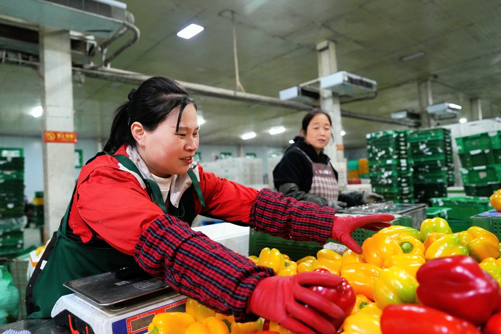 10月28日,在固安县顺斋瓜菜种植专业合作社的蔬菜加工车间,工作人员正在打包彩椒。