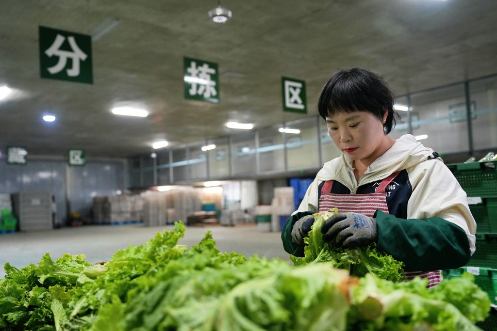 10月28日,在固安县顺斋瓜菜种植专业合作社的蔬菜加工车间,工人正在分拣生菜。