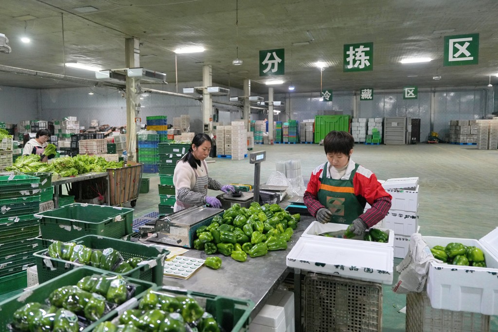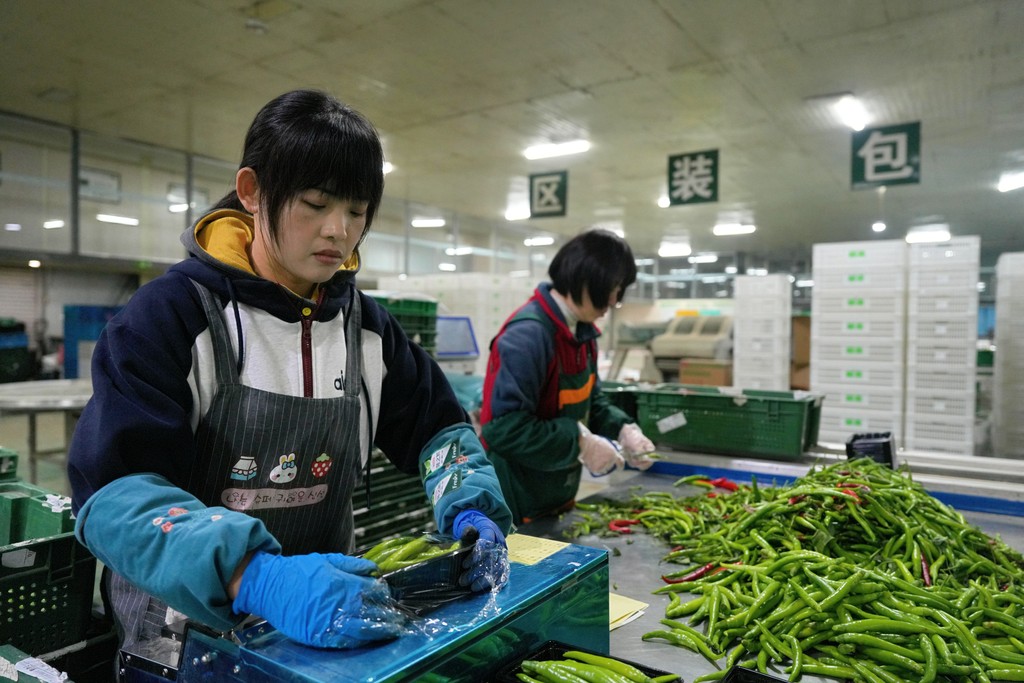 10月28日,在固安县顺斋瓜菜种植专业合作社的蔬菜加工车间,工人正在打包杭椒。