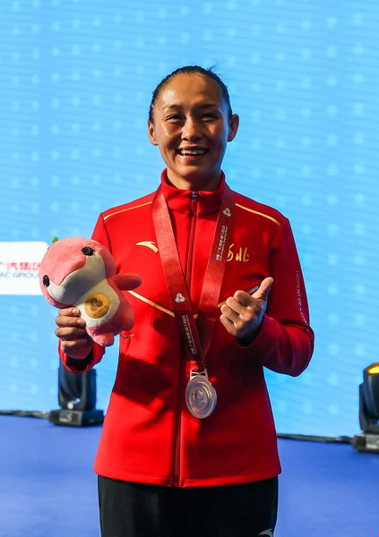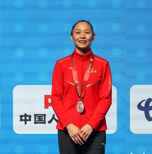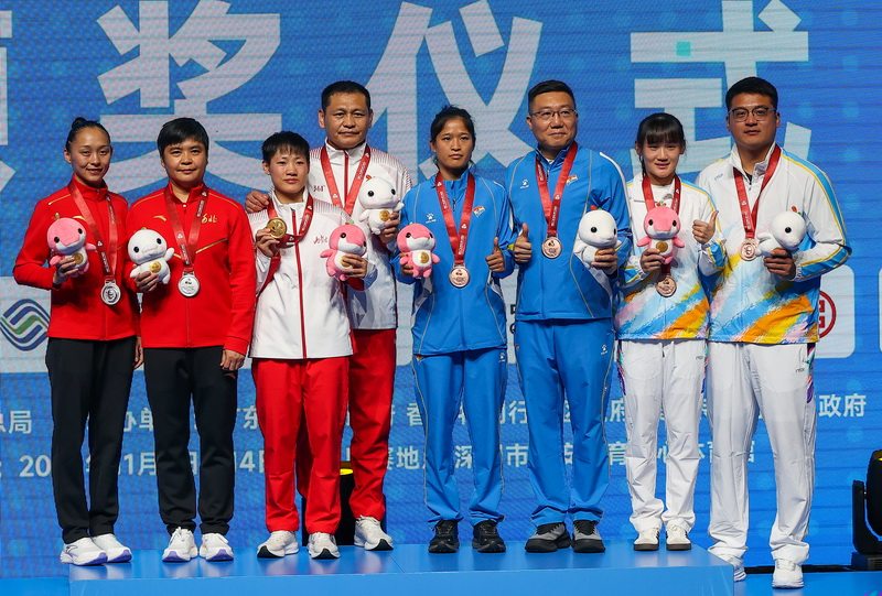 11月14日,河北运动员常园(左一)与教练员张喜燕(左二)站在领奖台上。