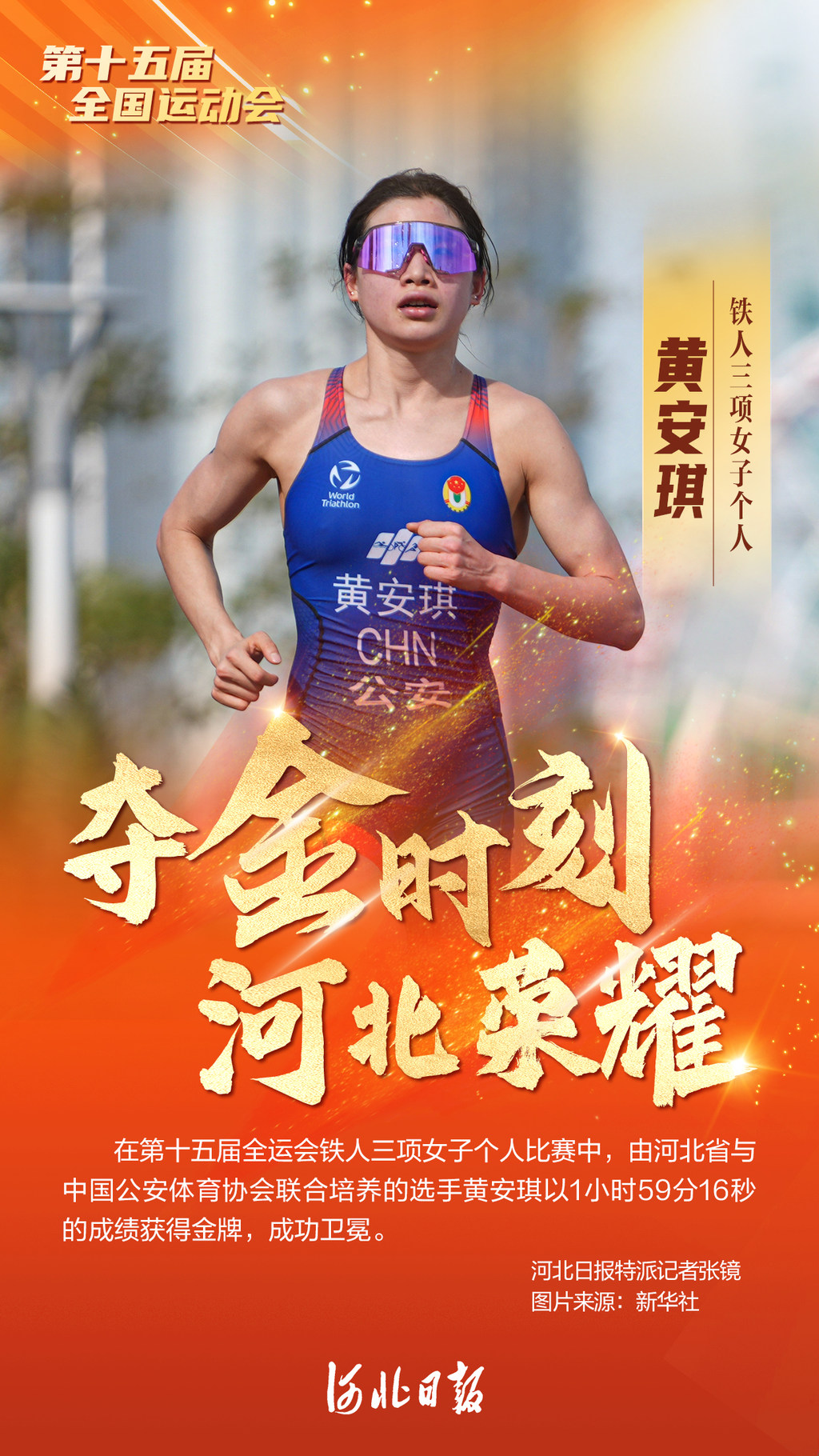 河北日报客户端11月15日讯(特派记者张镜)在刚刚结束的第十五届全运会铁人三项女子个人比赛中,由河北省与中国公安体育协会联合培养的选手黄安琪以1小时59分16秒的成绩获得金牌,成功卫冕。