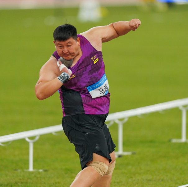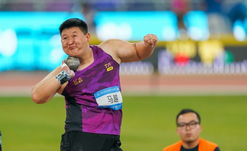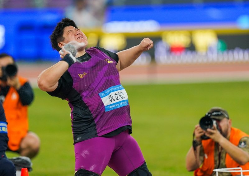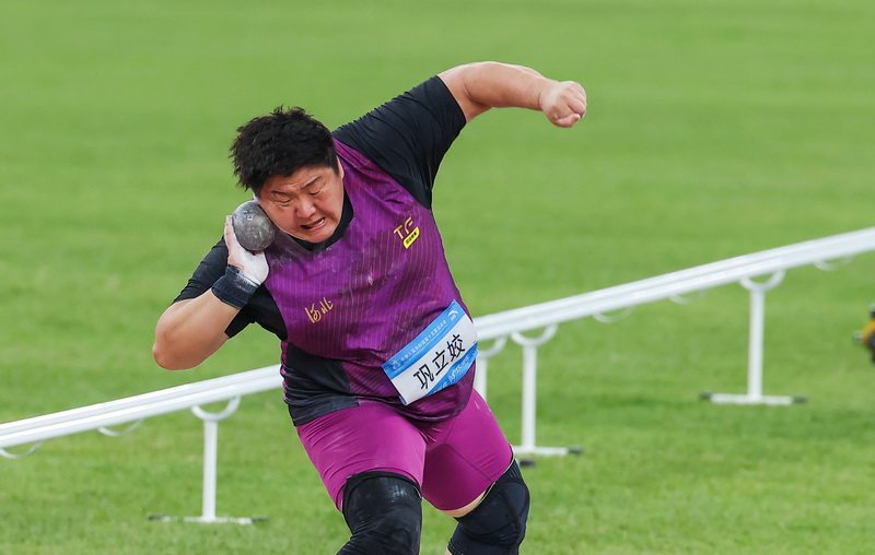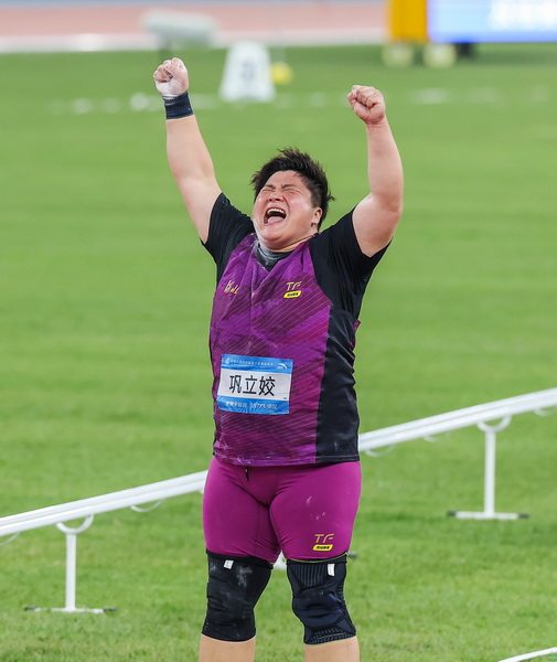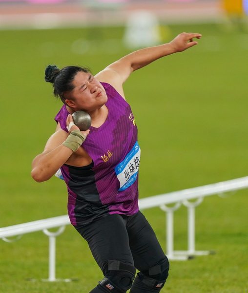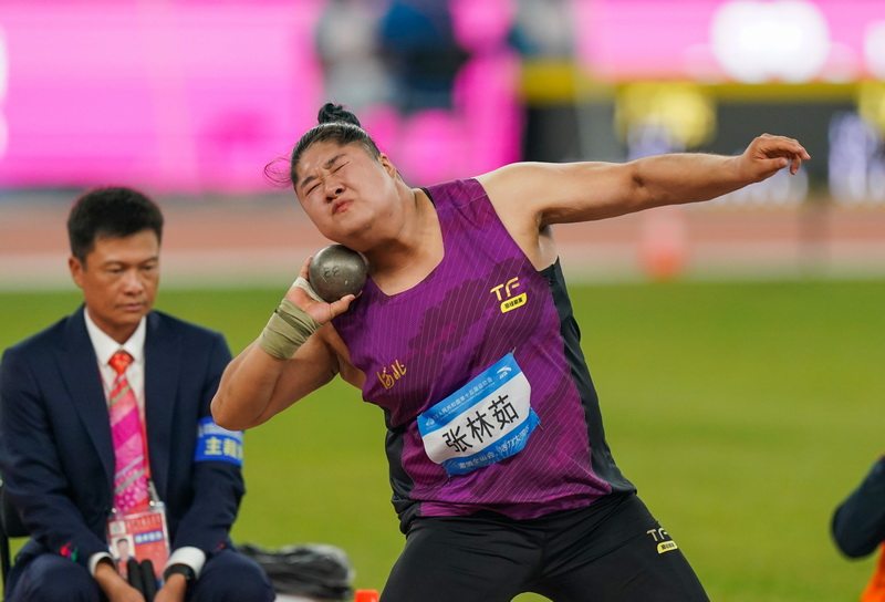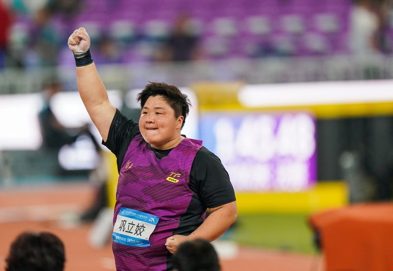 11月16日,河北运动员马越、巩立姣、张林茹(从左至右)赛后庆祝胜利。