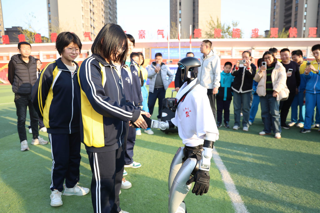 作为曾亮相春晚的“科技明星”,“宇树机器人”的表演更是引爆全场。机器人伴随着音乐跳起流畅舞蹈,精准灵活的动作引来阵阵欢呼;它还主动与同学们进行互动,挥手、转圈,甚至模仿“敬礼”动作,仿佛在以科技的方式传递“爱国”的信号。当机器人指向校园里的国旗时,现场掌声雷动,同学们“科技报国”的信念愈发坚定。