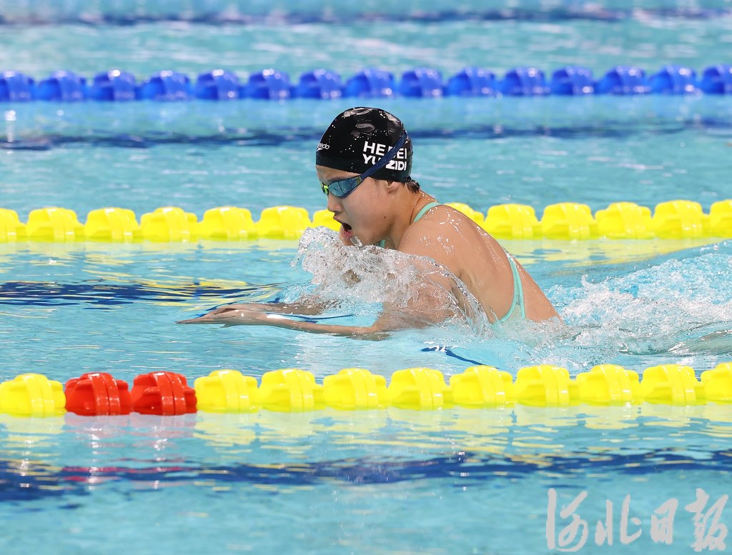 11月17日,在第十五届全运会女子400米个人混合泳决赛中,河北选手于子迪以4分34秒33的成绩获得金牌。这是本届全运会于子迪获得的第三枚金牌。图为于子迪在比赛中。河北日报记者耿辉摄