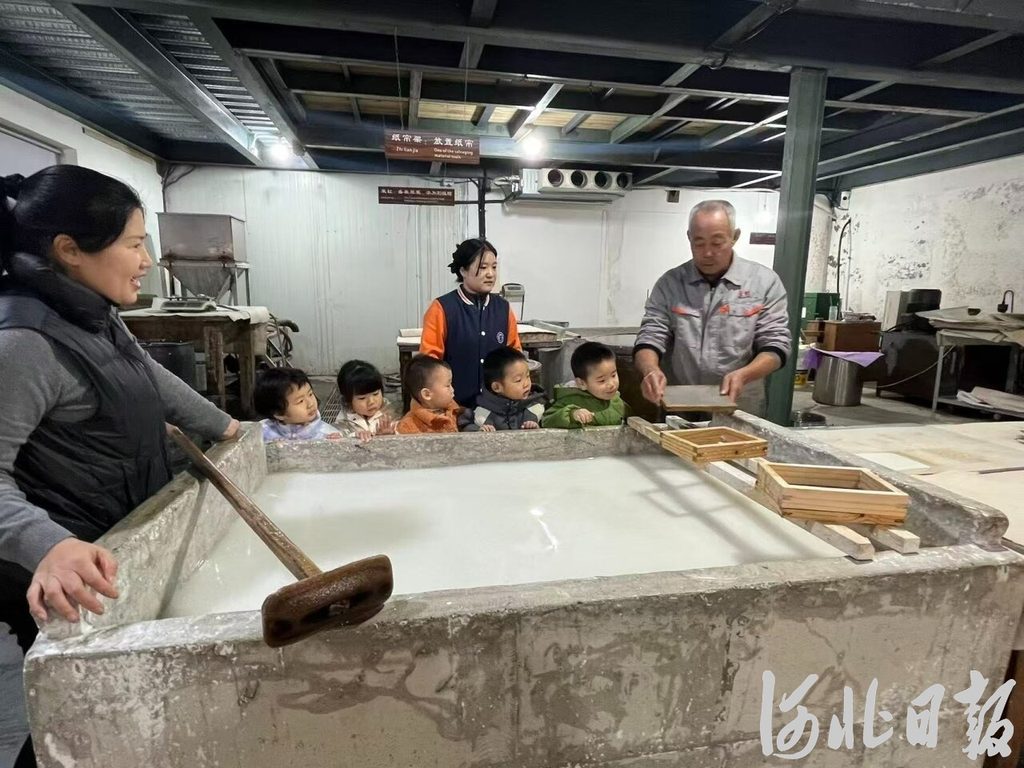 水彩纸上,你一笔我一画,稚嫩的小手涂下心中最美的色彩;手抄纸水槽边,小心翼翼地手持筛网盛满纸浆,体验“古法”造纸的神奇……11月13日,保定市竞秀区的宝虹艺术博物馆里,一群幼儿园小朋友正在进行纸文化研学。古法造纸、剪纸、拓印等一项项非遗技艺,在孩子们的指尖触碰中焕发生机。