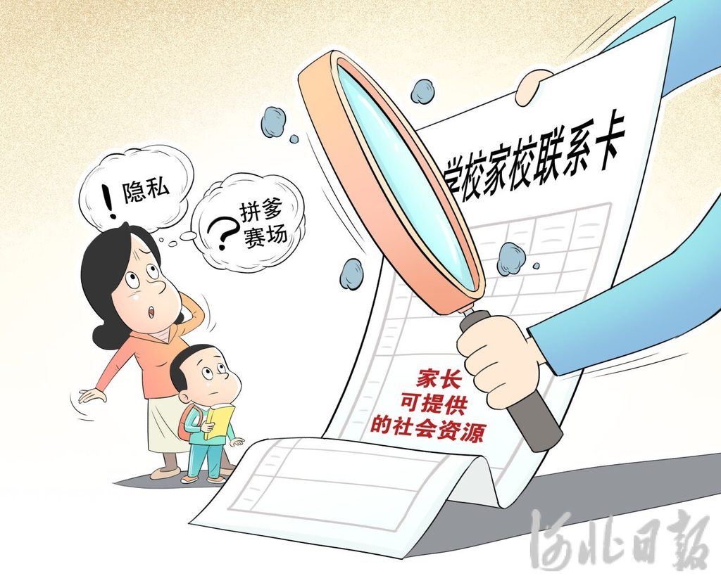 近日,山西省忻州市长征小学(西校区)的一张家校联系卡引发热议。网友晒出的图片显示,该联系卡“家长的擅长项目或可提供的社会资源”栏目中,设置了“您有什么擅长的技能,可以参与到学校的各类活动中”“可提供的职业资源有哪些”等问题。面对质疑,该校表示,已第一时间停止卡片填报收集工作,并向全体家长诚恳致歉。(据《南方都市报》11月15日报道)