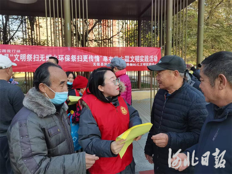 河北日报客户端讯(梁永红)寒衣节临近,11月18日,石家庄市无极县新时代文明实践中心、无极县民政局聚焦群众需求,在平安公园广场联合开展以“文明祭扫无烟火 绿色缅怀有温度”为主题的文明实践活动。