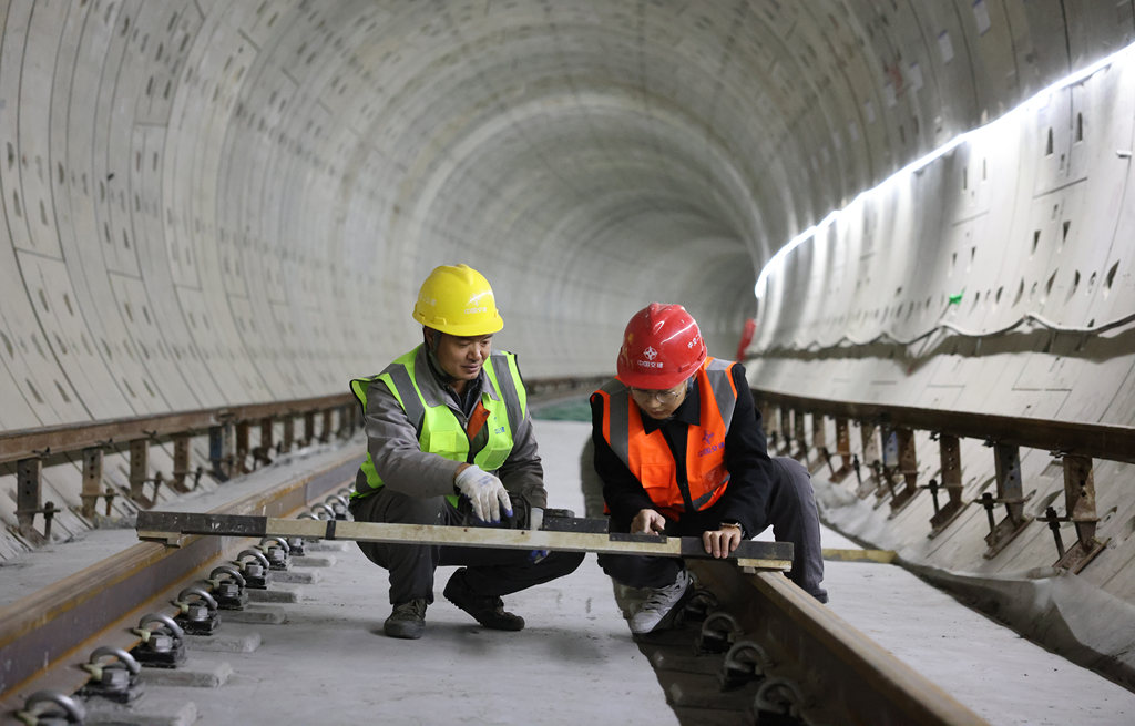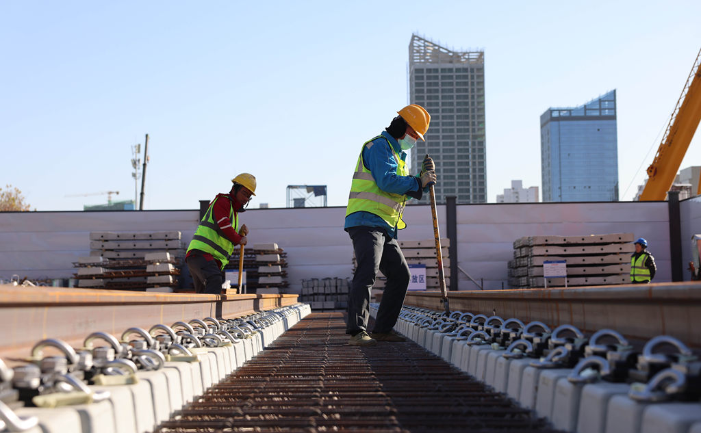 11月18日,工人在石家庄地铁4号线体育公园站施工作业。