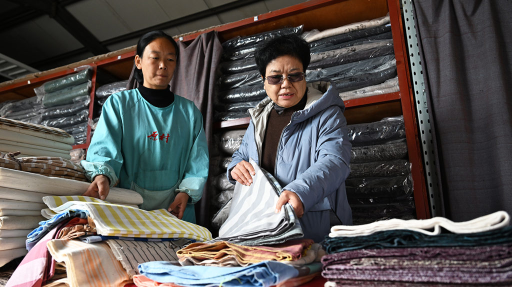 11月10日,赞皇原村土布纺织技艺第三代传承人崔雪琴(左)与合作社工作人员一起研究新织的样布。