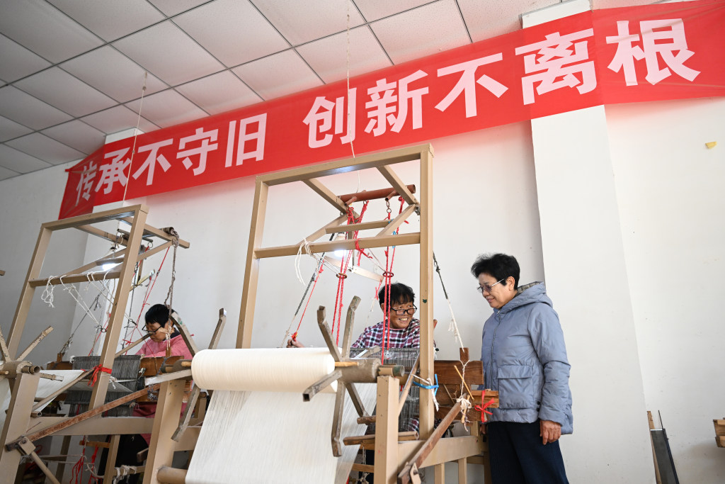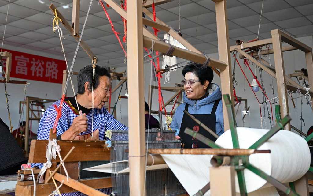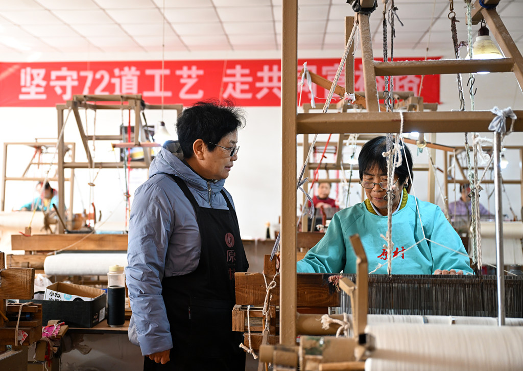 11月10日,赞皇原村土布纺织技艺第三代传承人崔雪琴(左)在非遗工坊了解织布情况。