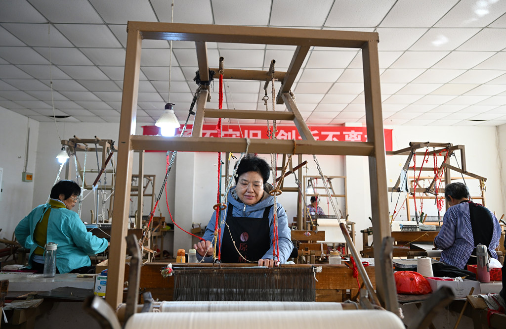 11月10日,赞皇原村土布纺织技艺第三代传承人崔雪琴(前中)在非遗工坊织布。