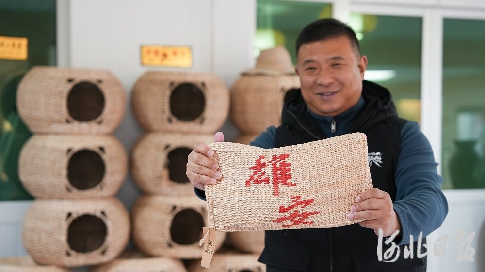 日前,在雄安新区安新县赵北口镇杨庄子村“创富工坊”,杨庄子村党支部书记杨志亮正在展示用蒲草编织的枕头。河北日报见习记者李畅摄