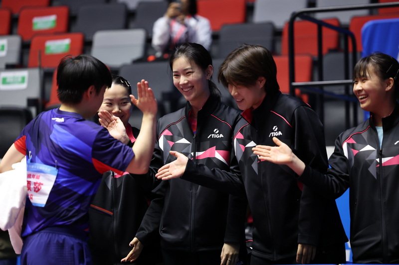 11月18日,河北队选手孙颖莎(前左)在比赛后与队友庆祝,她在单打比赛中3比0战胜辽宁队选手陈幸同。 新华社记者 梁旭 摄