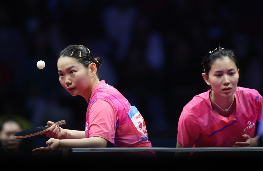 11月19日,河北队组合何卓佳(左)/王添艺在比赛中。最终,她们0比3不敌山东队组合王晓彤/陈梦。新华社记者 刘 续摄